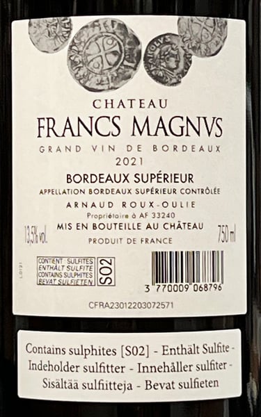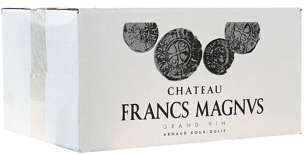 Château Francs Magnus Grand Vin 2021er fremstillet på et klassisk højrebredsblend bestående af 90% Merlot og 10 % Cabernet Franc, som Arnaud Roux-Oulié selekterer fra et fremragende beliggende, 13 hektar stort kalkstensplateau, der har mange ligheder med Saint-Émilions. Vinfremstillingen er langt i hænderne på legenden Stéphane Derenoncourt, som efter en streng kvalitetssortering omhyggeligt lader spontangæringen ske med hele druer for derigennem at fremme rødvinens frugtcharme. Daglige ”punch downs” samt overpumpninger af mosten trækker seriøs farve, smag og afstemte tanniner fra drueskindet, inden topvinen afslutningsvis fuldendes på et mix af tanke og 1 år gamle 225 liters barriquefade.