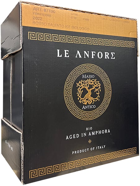 Den apuliske rødvin ligger først på Amfora’er af det porøse byggemateriale cocciopesto (kendt tilbage fra det gamle Rom), der via en kontrolleret mikrooxidering frembringer de blødeste tanniner i mands minde. Denne modningsmetode har været brugt i mere end 6000 år.