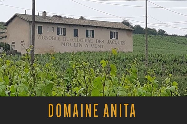Domaine Anita høster druer fra 18 hektar, der består af prestigiøse cru’er som Moulin à Vent, Morgon, Chénas og Fleurie. Anita råder over jordparceller på nogle af de mest prestigiøse lieux-dits i Beaujolais: ”Les Caves” og ”Rochelle” i Moulin à Vent, ”Moriers” og ”Poncié” i Fleurie samt ”Chateau-Gaillard” i Morgon og ”Les Brureaux” i Chénas. Markerne er velsignet med 40 til over 100 år gamle buskvine, hvis dybe rødder og høje beplantningstæthed giver få og små druer med et enormt kvalitetspotentiale, der fremmes yderligere ved grøn høst. Af de selekterede topdruer skaber Anita sin serie af dybt autentiske og flot anmeldte enkeltmarksvine.